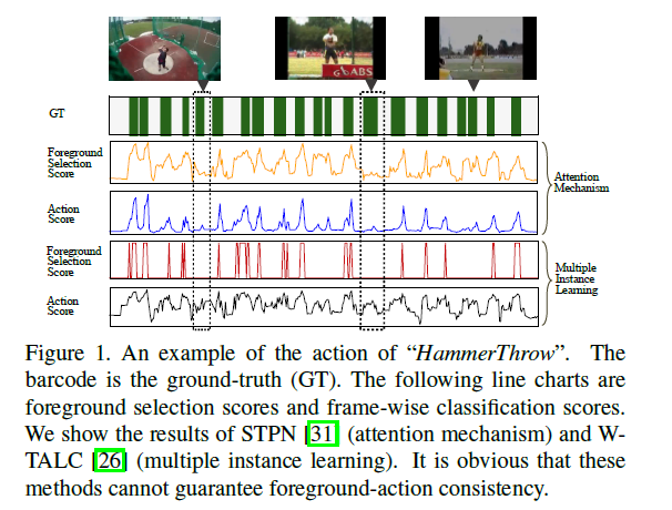 그렇다면 Figure 1을 통해 지적한 것들이 무슨 문제를 야기하는지 보겠습니다. 4개의 line chart 중 1, 2행은 각각 attention mechanism을 사용하는 기존 방법론의 foreground score, action score에 해당하고, 3, 4행은 각각 CAS를 사용하는 방법론의 foreground score, action score에 해당합니다. 1, 2행을 보면 less-discriminative한 부분은 제대로 잡아내지 못하고 있는 것을 볼 수 있습니다. 3, 4행은 foreground score는 낮지만, action score는 높아 foreground-action consistency가 깨진 상황에 해당합니다. 각 용어들이 어떤 의미를 갖는지는 뒤에서 설명드리겠습니다.