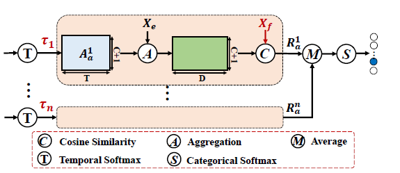 코사인 유사도를 구하는 두 대상이 각각 D차원의 벡터이므로, 각 클래스마다 하나의 스칼라를 얻을 수 있는 것입니다. 결국 S_{a}는 T개의 snippet 각각이 C+1개의 클래스에 속할 점수를 값으로 갖게됩니다.
