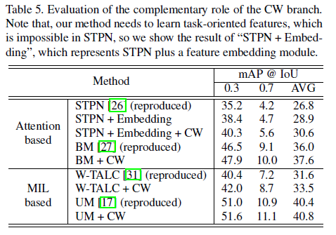 task 초반의 방법론인 STPN과 W-TALC에 CW branch를 붙여주니 성능이 둘 다 1.5% 이상 크게 오른 것을 볼 수 있습니다. 그 당시 최근의 방법론인 UM에서도 소폭이지만 성능이 향상하는 것을 볼 수 있습니다.