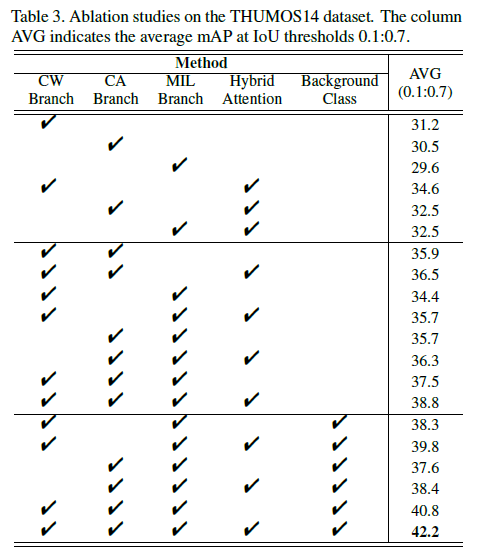 Action과 Foreground의 상호 보완성을 보겠다는 것은 알겠는데 용어 선택이 참 복잡하네요. top-k의 문제점을 대신하기 위해서 MIL branch가 도입되었다고 적혀있고, 대충 어떻게 score를 뽑는지는 알겠는데요. 그림상을 보면 MIL이 CW와 같이 쓰여야 하는 것으로 보입니다. 그럼 ablation에서도 CW 단독 / CW+MIL 성능이 있어야 top-k 보다 좋다는 것을 보일 수 있을 것 같은데. 이 부분에 대한 설명이 혹시 있나요?