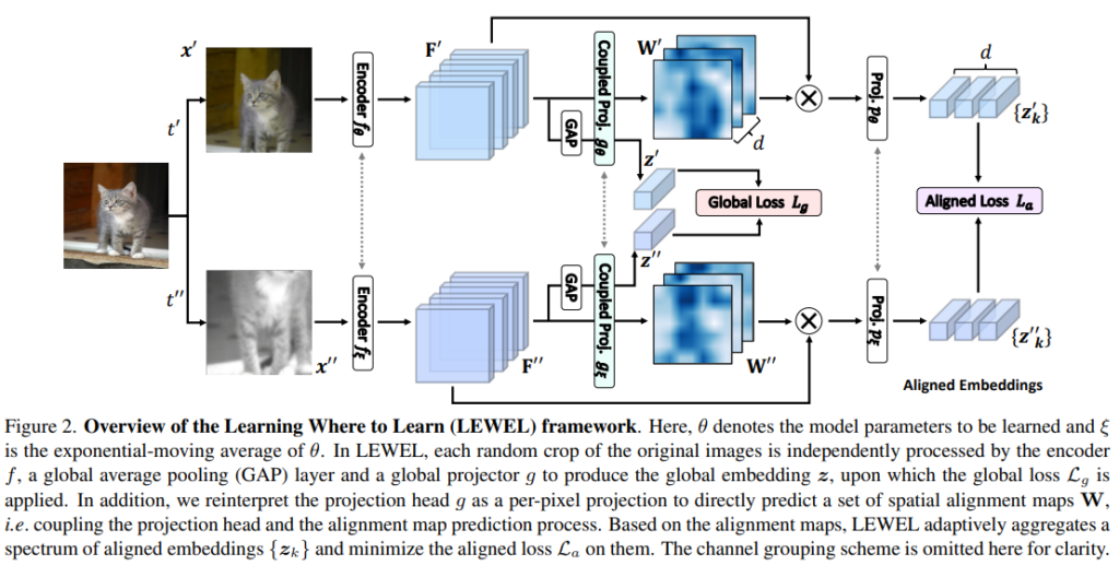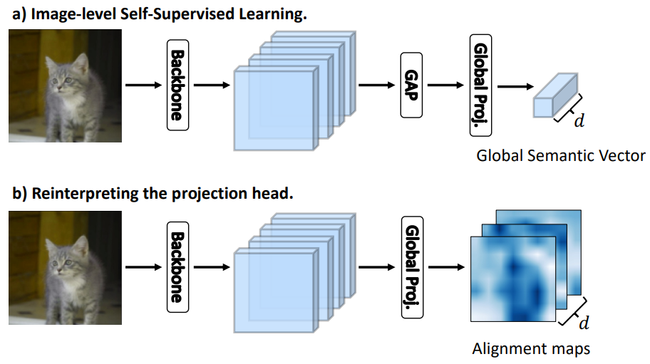 Self-supervised learning(SSL)은 모델의 학습을 위해 이미지에서 물체의 불변성을 활용한다. 특히 이미지에 서로 다른 augmentations을 적용하여 학습에 사용하는데, 이때 random crop 등으로 object가 손실되거나 misalignment가 발생하는등, 문제가 발생할 수 있다. 논문에서 제안하는 Learning where to Learn(LEWEL)은 feature의 spatial information을 활용하여 배경이 아닌 object(학습 대상)에 집중하게 해, feature learning을 더 잘 하도록 만든다. 본 논문은 학습 시 이미지의 object에 집중하기 위해 semantic segmentation에서 영감을 받아 Self-supervised learning 의 projection head를 per-pixel prediction으로 재해석 하였다. 기존 방법론은 [그림1]의 a)와 같이 Global Average Pooling (GAP)를 통해 클래스를 예측했다면, 제안하는 방법론은 alignment map 이라는 pixel 단위 예측을 학습에 활용하였다.