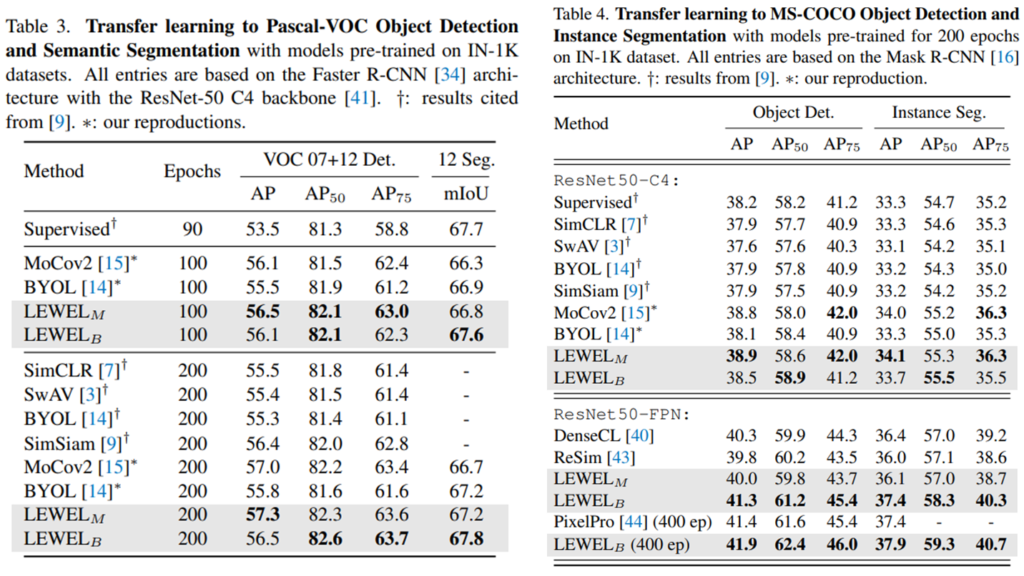 제안하는 방법론은 기존 방법론과 비교하기 위해 imagenet dataset에 대해 linear classification과 semi-supervised learning의 성능 비교를 진행하였으며(table1, table2), table3,4에서 transfer learning을 통해 pretrain method 방법론으로써 우월성을 보였다. 이때 Pascal VOC 데이터셋으로 object detection task를 MS-COCO dataset으로 object detection과 semantic segmentation 성능을 보였다.