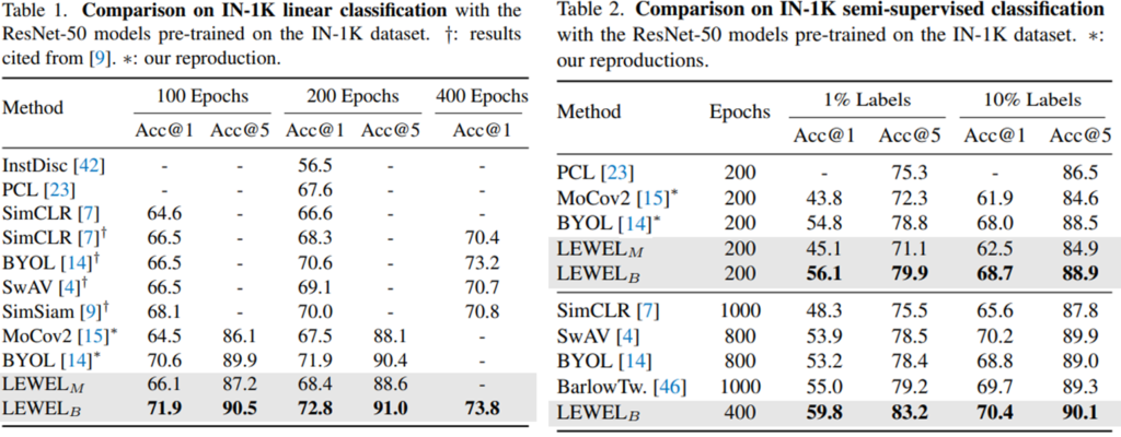 제안하는 두 학습 방식에서 z’과 z”간의 거리를 계산하는 loss함수는 InfoNCE와 Mean Square Error(MSE) loss를 이용했으며 실험에서는 LEWEL_M(InfoNCE), LEWEL_B(MSE)로 리포팅하였다.
