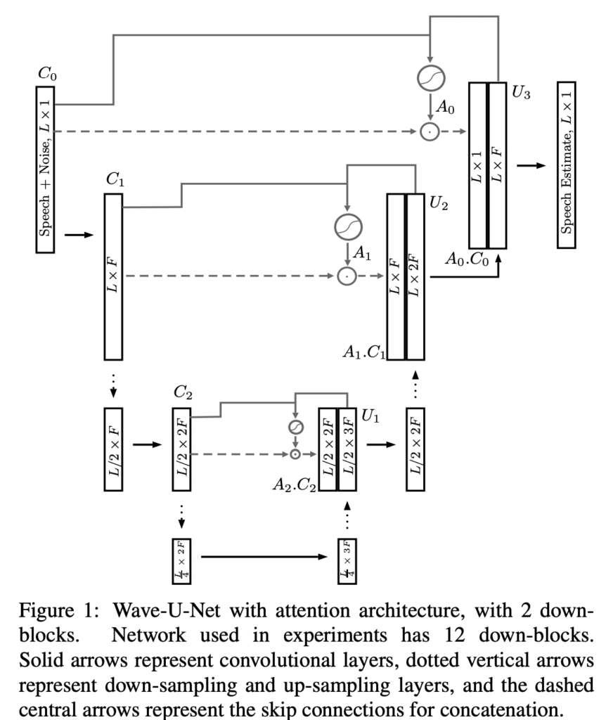 그 전에 다시 한번 정리하자면, 이 논문은 Wave U-Net에 어텐션 모듈을 붙혀서 제안한 방법론입니다. Wave U-Net 은 원형 음원을 그대로 사용하기 위해 U-Net의 2차원 conv를 1차원으로 변형한 것이며, 원형의 음성을 사용하기 때문에 타임 도메인 신호에서 직접 작동하게 됩니다.