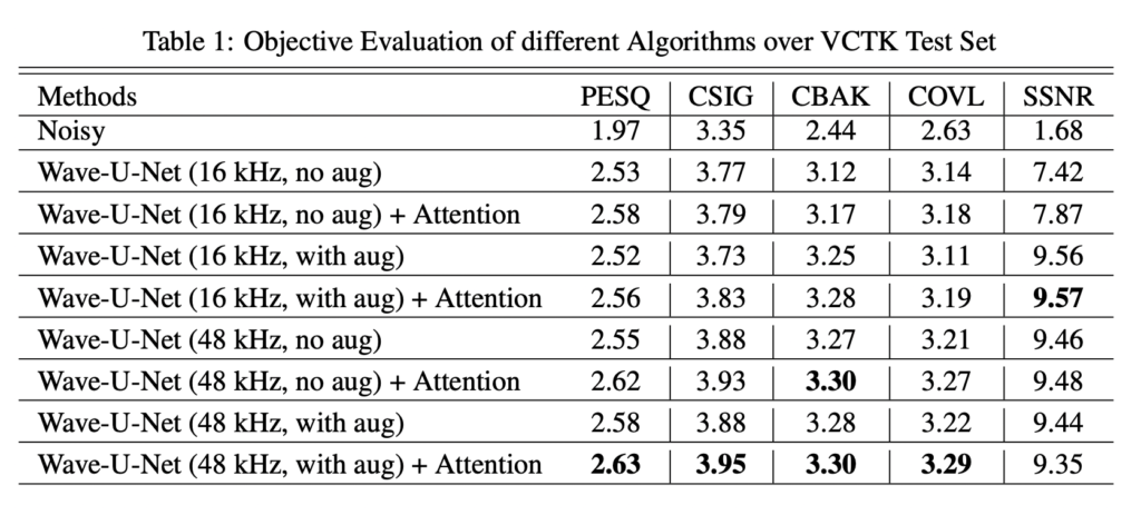 우선 하단 테이블은 소음의 크기 및 어텐션 모듈 등 ablation study라고 봐주시면 좋을 것 같습니다.