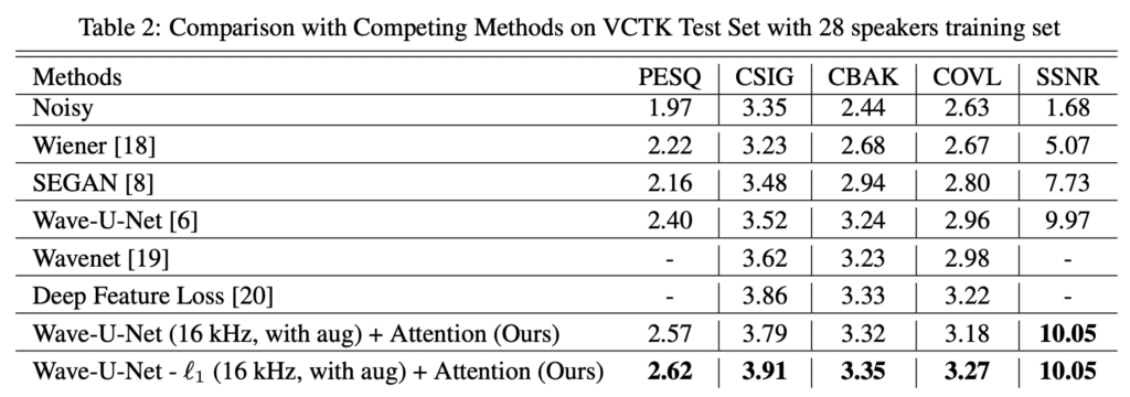 딥러닝의 적용은 음성이라고 이미지와 다르지 않습니다. 이미지 도메인과 비슷하게 미리 정의한 feature를 추출하는 기계학습적 방식에서, 딥러닝 방식의 등장은 Raw wave 를 직접 사용하여 노이즈를 제거하는 방식으로 이어진 것입니다. 아래 테이블은 기존에 SOTA라고 불리는 아래 4가지 방법론과 기계학습적 디노이징 필터들과 비교하였습니다