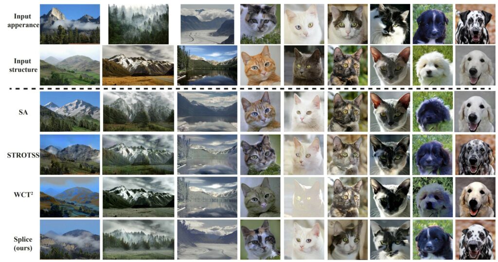 보시면 STROTSS의 경우 Color가 번지는 color bleeding 현상이 종종 발생하는 것을 확인하실 수 있으며, WCT의 경우에는 global color로 영상이 도배되버리는 현상이 발생합니다. 즉 semantic한 정보를 잘 고려해서 필요한 부분에 대해서만 색감이 입혀져야하는데 그냥 appearance 이미지의 평균 색감을 그대로 입혀버리는 것이죠.