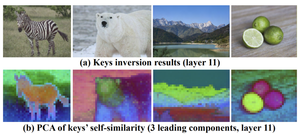 하지만 DINO-ViT의 경우에는 global token(즉 CLS token)이 해당 영상의 visual appearance를 잘 표현하고 있어 영상의 텍스쳐 정보 뿐만 아니라 물체의 부분부분들에 대한 global 정보를 가지고 있다고 합니다. 또한 가장 깊은 레이어에서 추출한 feature의 경우에는 매우 높은 구조적 정보와 의미론적인 정보를 담고 있기 때문에 저자의 목표와 매우 적합하다고 주장합니다.
