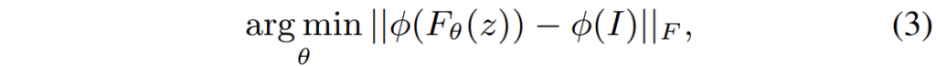 그런데 영상을 최적화하는 방식은 수렴이 잘 안된다는 기존의 연구결과들을 토대로, 저자는 Deep Image Prior 방법론과 동일하게 고정된 random noise z를 출력 영상으로 변환시키는 CNN F_{\theta} 의 weight를 최적화하는 방식으로 Feature conversion을 수행하였습니다.