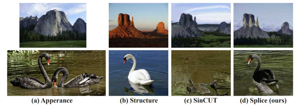위의 결과는 Image Translation 방법론인 SinCUT과의 비교 결과입니다. Image Translation 기법은 첫번째행처럼 low-level의 정보들 사이에서는 변환이 잘 되는 것을 볼 수 있으나, 2번째 행같이 조금 복잡한 의미론적 정보에 대해서는 올바르게 변환이 되지 못하는 것을 확인할 수 있습니다.