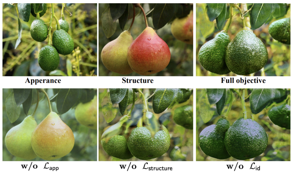 다음은 Ablation study에 대한 정성적 결과 비교 입니다. loss를 모두 활용한 경우에는 구조적 정보도 온전하면서 style이 잘 입혀진 것을 확인할 수 있습니다만, appearance loss를 적용하지 않을 경우에는, 과일의 표현력이 잘 담기지 않는 것을 확인할 수 있습니다.
