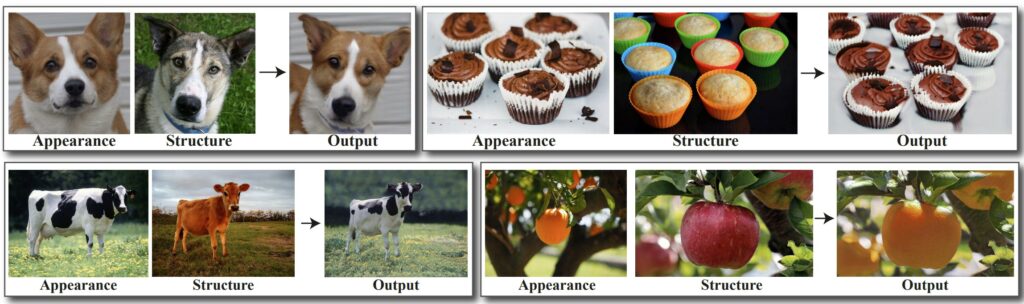 마지막으로 위의 결과는 appearance image와 structure 이미지가 의미론적으로는 같지만 실제와는 다른 경우거나, 또는 의미론적인 정보도 다르고 class 카테고리도 다른 경우 등에 대해서 변환 결과를 나타낸 것입니다. 아무래도 두 영상 사이의 의미론적인 정보가 겹치지 않게 되면 모델이 학습을 정확히 할 수가 없어 결과가 썩 좋지 못한 것을 확인할 수 있습니다.