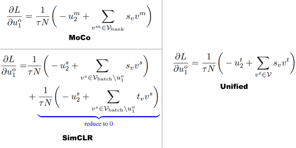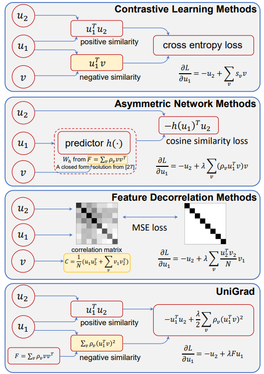 본 논문은 overview에서 소개한 세가지 접근법을 gradient 관점에서 통합하였다. 먼저 각 방법을 3가지 요소로 나누었는데 이는 다음과 같다:positive gradient, negative gradient, a scalar that balances theses two terms. 예를 들어 positive gradient와 negative gradient는 contrastive learing에서 positive sample, negative sample의 영향과 유사하다. 즉, contrasive learning은 위의 3가지로 구성된 gradient의 specific formula중 하나이다. 저자들은 이러한 unified framework를 UniGrad라고 이름지었는데, positive samle간의 유사도를 최대화 시키고, negative sample간의 유사도는 0에 수렴하도록 학습하기 위한 메커니즘을 명시적으로 가지고 있다. [그림1]을 참조하여 각 접근법에 대해 간단히 소개한것은 아래와 같다.