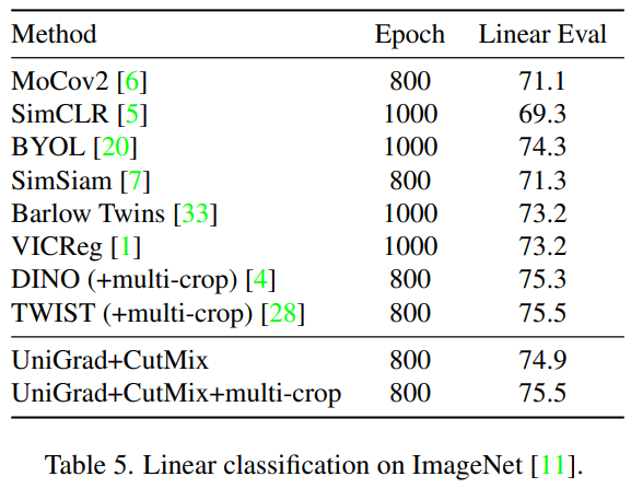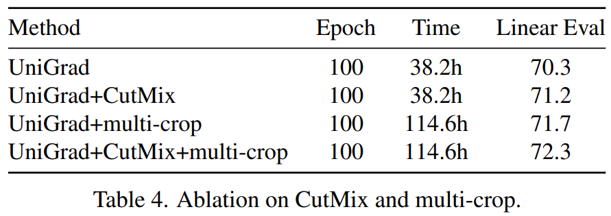 다음은 imagenet데이터에 대한 모델의 표현력을 입증하는 linear classification 실험이다. 동일한(혹은 유사한) 학습 epoch 기준으로 높거나 같은 성능을 보여 모델의 표현력을 입증하였다. 또한 multi-view를 생성할 때 사용한 augmentation option(cutmix or cutmix+multi-crop)에 따른 리포팅을 제공한다. 이러한 조합은 [표3]의 ablation study 실험에 따라 선정된 듯 한데, multi-crop에 context 손실이라는 변수(앞선 소개 논문 LEWEL에서 해결하고자 했던 문제)가 있음에도 명확한 성능향상을 보이는것이 흥미로웠다.