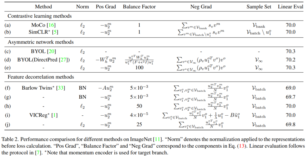 학습을 위해서 가공이 되지 않은, 비가공 데이터로부터 학습을 가능하게하는 self-supervised learning은 다양한 연구가 진행되어왔다. 또한 현시점에서 일반적으로 다음의 3가지 관점으로 나뉜다: 1) contrastive learning(MoCo), 2) asymmetric network methods(BYOL), 3) feature decorrelation methods(Barlow Twins). 흥미롭게도 본 논문은 이러한 접근법을 통합할 수 있다고 주장한다. 또한 통합된 형식으로 다양한 실험하여 각 방법론을 비교하였으며 결론적으로 momentum encoder가 성능 향상의 주요 요인임을 확인했다고 주장한다. 최종적으로, momentum encoder라는 성능 향상 요인에 입각하여 UniGrad를 설계하였으며 memory bank와 predictor없이 SOTA 성능을 달성하였다고 한다.
