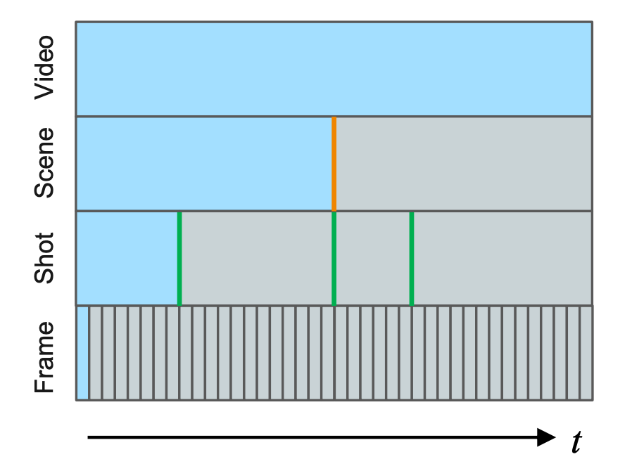 Shot의 연속으로 보통 짧은 story line을 만들 수 있는 정도의 프레임 집합체로 정의합니다. Scene의 정의가 조금 의미론적이라 모호하게 느껴질 수 있을 것 같습니다. 결국 여러개의 Shot으로 구성된 Scene을 구분하는 것은 Challenging한 Task 입니다.