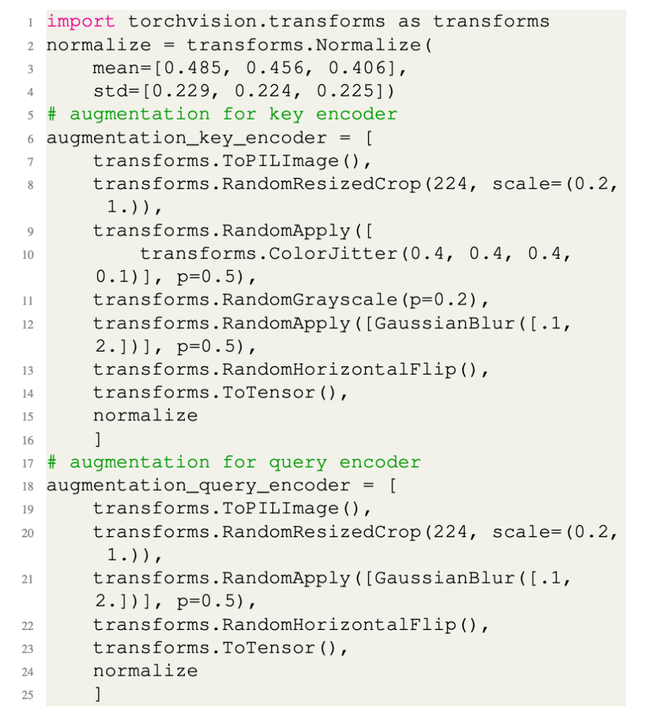 Query Encoder에서는 ColorJitter, RandomGrayscale이 빠진 것을 확인할 수 있습니다.
