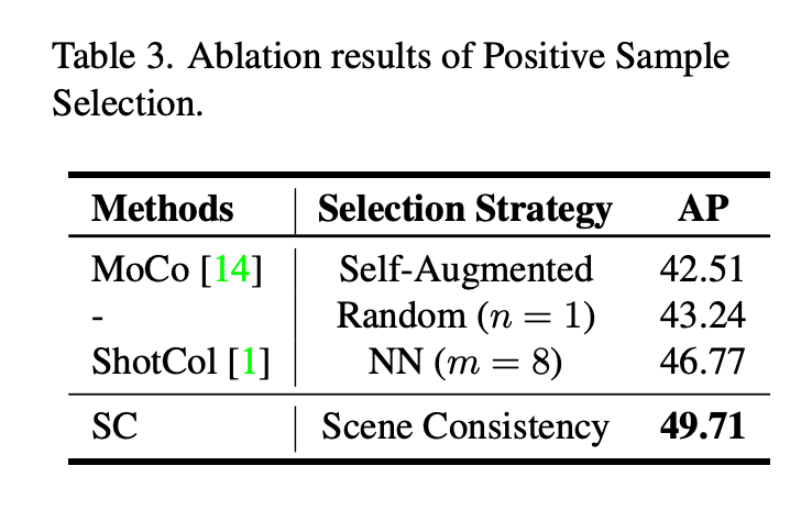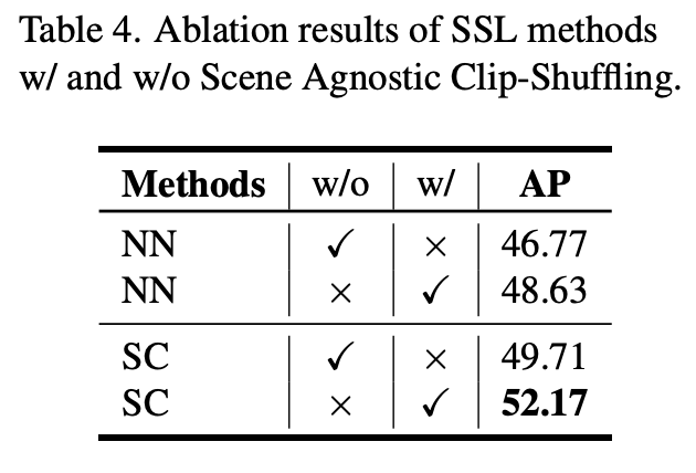 위에서 잠시 언급했던 shuffling 방법에 대한 ablation 입니다. NN 방식이든 Scene Consistency 방식이든 AP를 의미있는 정도의 수준으로 향상 시킬 수 있었네요.