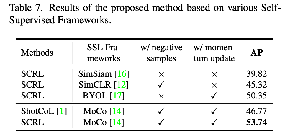다양한 SSL framework 내에서의 실험입니다. 각 방법론마다 성능의 변화가 좀 크긴 한데 최종적으로 momentum update 기반의 MoCo가 가장 좋은 성능을 보여줍니다. 사실 SimCLR, MoCo, BYOL 논문을 자세히 읽어본적은 없어 여기에 대해서는 추가적인 저의 설명을 드리기 좀 어려울 것 같습니다.