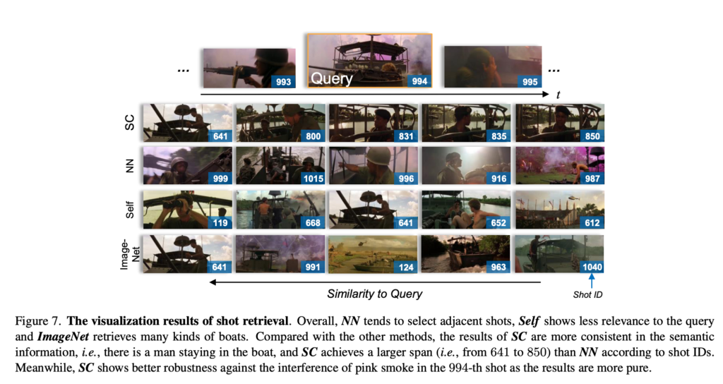 994라는 shot ID를 가지는 shot에 대해서 shot끼리 유사도를 계산했을 때 Top-5를 검색한 결과입니다. Scene Consistency가 확실히 동일한 장면에 대한 shot을 검색했다는 느낌이 가장 강하게 오네요. NN이나 Self 같은 경우는 다른 장면에서 따온 shot인 것들도 몇개 보입니다. Image-Net은 그냥 다양한 보트의 shot을 검색했네요.