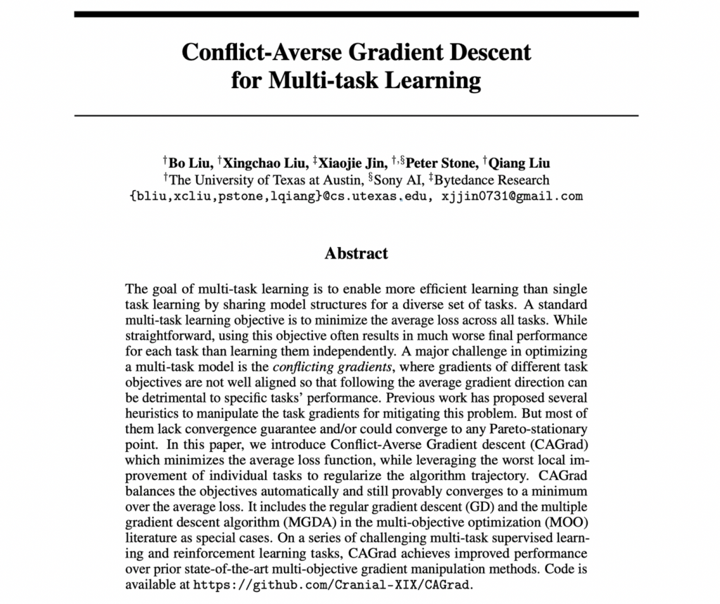 오랜만에 본업으로 돌아와서 관련 논문을 리뷰할 수 있게 되었네요. 이제 10월이 되었으니 부지런히 저의 연구를 위해 달려봐야 겠습니다. 제가 이번에 리뷰할 논문은 몇개월 전에 리뷰한 PCGrad의 뒤를 잇는 Multi-task learning의 최적화 어려움을 해결하고자 제안된 논문입니다.