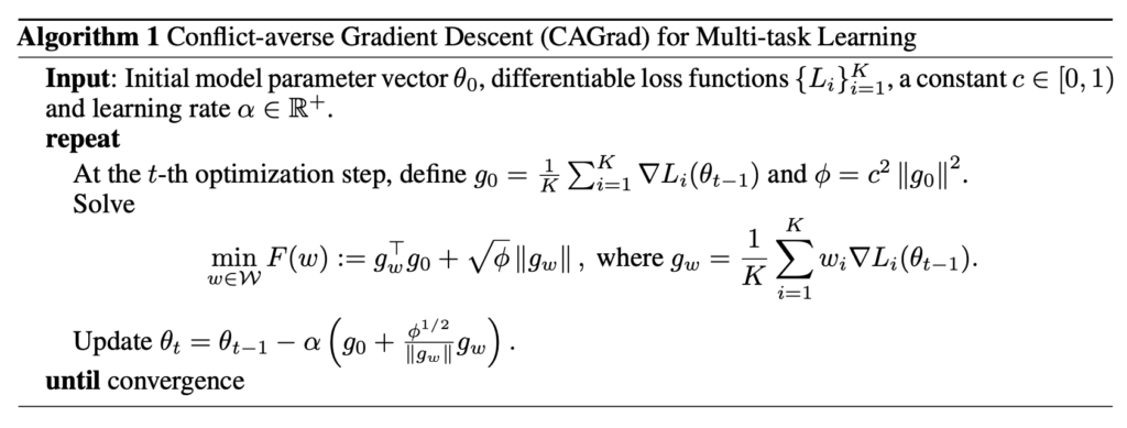 특정 태스크의 Loss의 최소 감소율을 명시적으로 최적화하는 동시에 평균 Loss로 수렴하는 알고리즘이었습니다. 제가 PCGrad를 사용하면서 느낀점은 굉장히 메모리 소비도 많고 느리다는 것인데, 해당 방법론도 직접 코드를 통해 확인해봐야겠습니다.