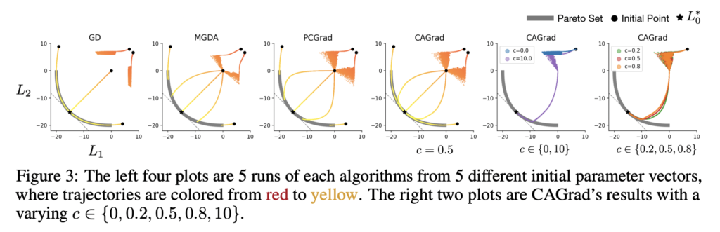 질문 (1) CAGrad, MGDA 및 PCGrad는 실제로 이론적 특성과 일관되게 움직이는가? (YES)