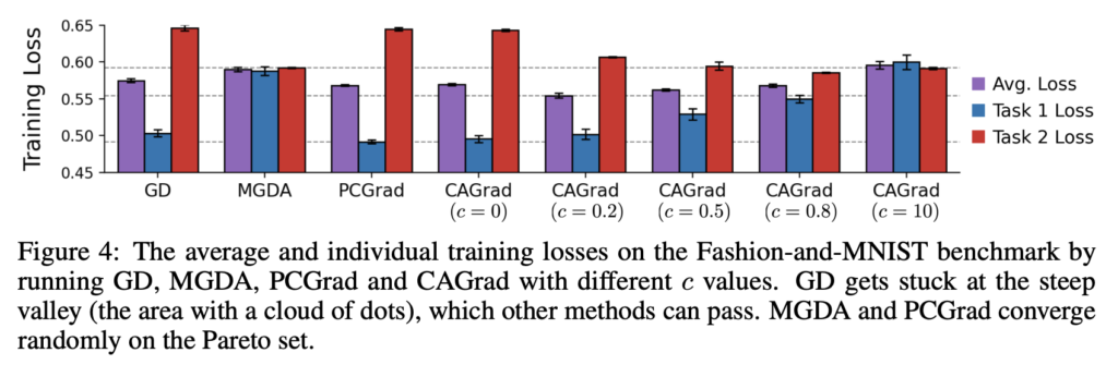 우선 (1), (2)에 답변하기 위해, 간단한 Toy 최적화 문제를 만들어 비교 실험을 진행합니다. c를 조절하면서 CAGrad가 GD와 MGDA를 복구하는 것을 보이기 위해, LeNet으로 멀티 패션 MNIST에서 실험을 진행하였습니다.