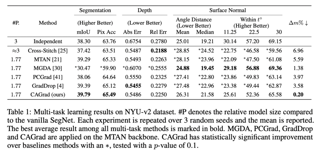 이제 여기서부터는 3번재 질문에 답변하기 위해 PCGradd와 동일한 설정에서 실험을 진행하였습니다. NYU-v2와 CItyScapes 데이터셋에서 실험을 진행하였는데, NYU-v2에는 class semantic segmentation, Depth estimation, surface normal prediction가 포함됩니다. 즉 3가지의 MTL이 수행됩니다. Cityscapes에서는 7개의 클래스 단위로 Semantic Segmentation, Depth Estimation 2가지의 태스크가 수행도비니다.