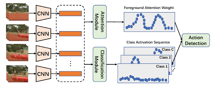 여러 접근법 중 위 그림과 같이 비디오의 각 segment가 특정 클래스에 관계 없이 Action에 해당할 확률인 ‘Foreground Attention Weight’와 각 segment가 특정 클래스에 속할 확률을 매트릭스 형태로 나타내는 ‘Class Activation Sequence'(CAS)를 추출하여 task를 수행하는 방식이 활발히 연구되고 있었고, 가장 좋은 성능을 보였습니다.