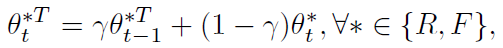 RGB, Flow model은 기존 back propagation의 방식대로 파라미터가 갱신되는데, RT, FT model은 아래 식과 같이 exponential moving average 방식으로 파라미터를 갱신합니다.