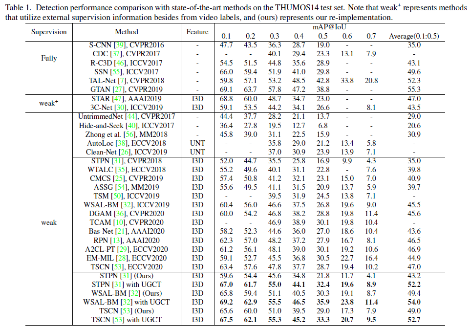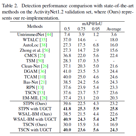 THUMOS dataset에서의 벤치마크 성능입니다. STPN, WSAL-BM, TSCN 방법론에 UGCT를 붙인 성능을 보시면 되는데, 모든 tIoU 기준으로 성능이 많이 오른 것을 볼 수 있습니다.