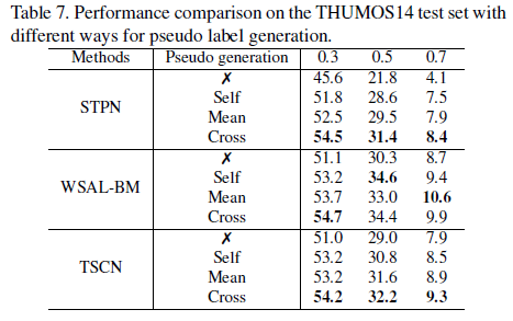 다음은 pseudo label을 만드는 방식 차이에 따른 성능입니다. X는 pseudo label을 사용하지 않은 경우, self는 RGB와 Flow가 각각 자신 모달의 teacher로부터 나온 pseudo label로 학습한 경우, mean은 각 모달에서 얻은 2개의 pseudo label을 평균 내어 학습에 사용한 경우, cross는 논문에서 소개된 방식입니다.