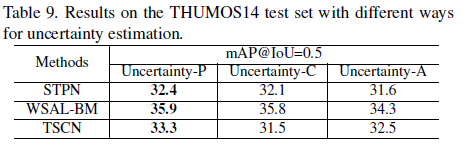 마지막으로 살펴볼 만한 실험은 uncertainty를 추정하는 방식에 따른 성능 차이입니다. P는 prediction module을 사용하는 논문에 소개된 방식이고, C는 consistency로 하나의 segment에 대해 서로 다른 두 random noise를 각각 적용한 후 Teacher model에 태워 두 개의 pseudo label을 얻습니다. 그리고 두 pseudo label 간의 차이를 uncertainty로 지정합니다.