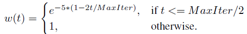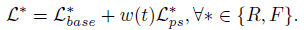 최종 loss \mathcal{L}은 기존 방법론에 있던 loss \mathcal{L}_base\mathcal{L}_ps의 가중합으로 계산됩니다. 이 때 w(t)를 학습 iteration에 따라 달리하는 gradual learning이 적용되었습니다.