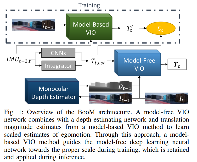 전통적인 model-based 방법론이 딥러닝 기반의 방법론보다 당시에 좋은 성능을 나타냈다고 합니다. 해당 논문은 Bootstrapped Monocular VIO(BooM)이라는 방법론을 제안하여 전통적인 방법론을 통해 얻을 수 있는 기하학적 정보를 이용하여 복잡한 데이터를 이용할 수 있는 scaled 단안 VIO 방식을 제안합니다. 제안된 방법론은 end-to-end로 학습이 가능하며, 비지도 방식을 이용하여 VIO odoemtry와 depth estimation을 학습합니다.