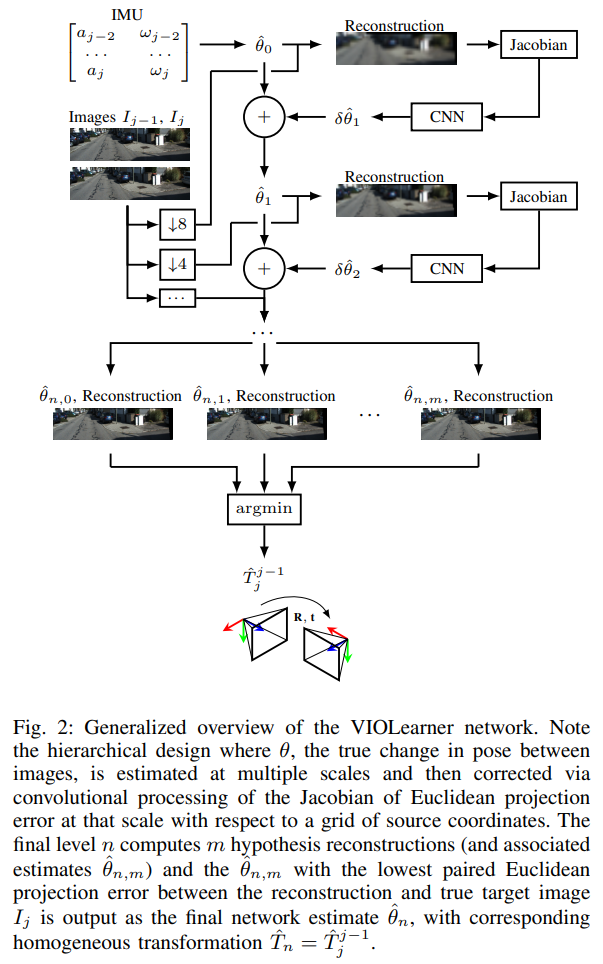 그림2. VIOLearner의 overview. 이미지간의 실제 pose 변화값인 θ는 여러 값을 추정이 된 후 자코비안에 convolution을 거쳐 보정이 되며, 이러한 과정이 계층적으로 이루어집니다. 최종 n번째는 m개의 reconstruction을 계산하며 유클리디안 error가 가정 낮은 값을 최종적으로 선택하게 됩니다.