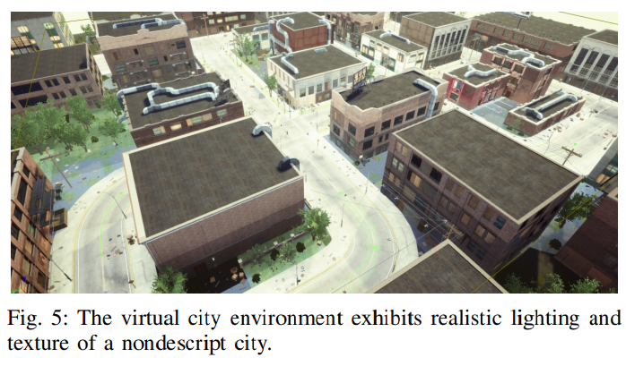 해당 데이터 셋은 게임 개발 플랫폼인 Unreal Engine을 이용한 시뮬레이션을 통해 생성된 데이터 셋입니다. 아래의 그림5를 통해 예시를 확인할 수 있으며, 상공에서 촬영된 영상으로 구성되어있습니다. 이미지는 11.11Hz, IMU는 111.11Hz로 촬영되었고, 속도는 0~8m/s로 가정하였다고 합니다. 학습, 검증, Test 셋은 각각 10, 2, 2개의 셋으로 구성됩니다.