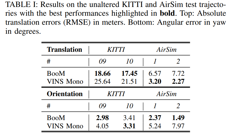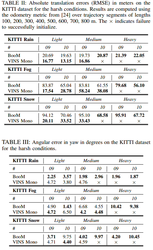 KITTI와 AirSim 데이터의 test 셋에 대해 augmentation을 적용하여 실제 환경에서 촬영될 수 있는 문제 상황을 가정하였다고 합니다. 이러한 과정을 통해 rain, fog, snow 환경을 모사하였다고 합니다. 또한, 실험은 VINS-Mono(전통적인 방식)의 정확도가 떨어지는 상황에 대해서 성능을 평가하였다고 합니다.(이 논문에서 보이고자 한 것이 전통적인 방식이 잘 작동하지 않는 상황에서 딥러닝 방식이 더욱 강인하다는 것이기 때문인 듯 합니다.)