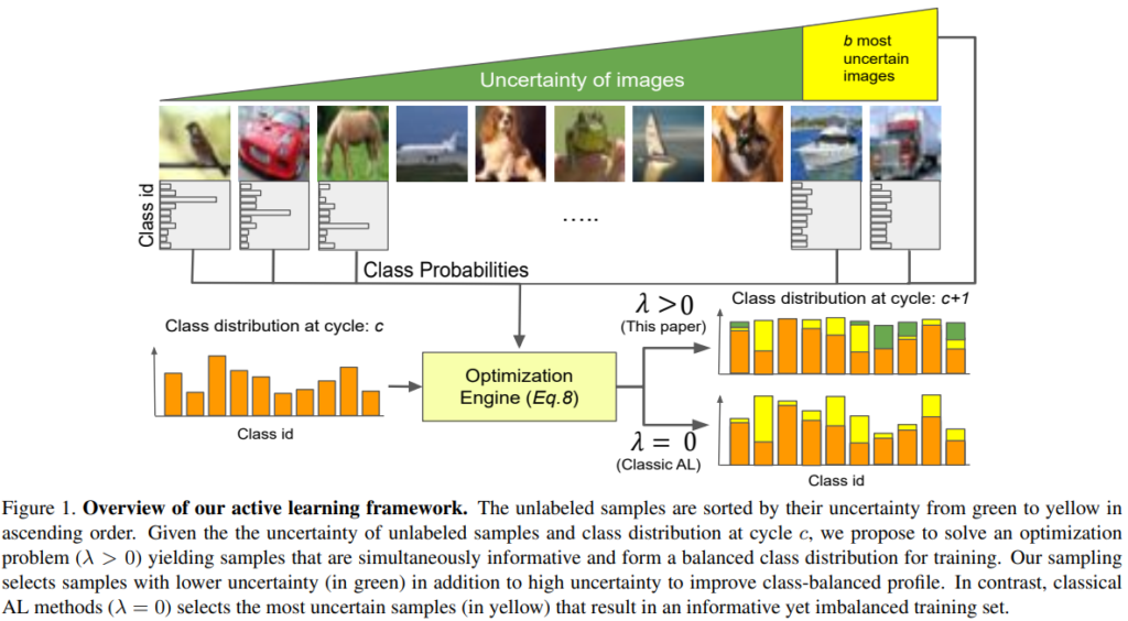 Uncertainty기반 Active Learning(이하 AL)은 모델이 학습이 불완전한 데이터를 고가치 데이터로 선별하여 데이터 가공을 요청하는 방법론으로 그림1의 우측 하단에 λ=0 상황과 같이, 상대적으로 어려운 데이터셋을 더 수집하게 되는 class-imbalance 문제가 발생할 위험이 있다. 이에 대응하기 위하여 해당 논문은 high uncertinty data 중 일부를 이용해 다음 사이클을 위한 데이터셋에서 long-tail 문제가 발생하지 않도록 보정하는 새로운 AL 프레임 워크를 제안하였다.