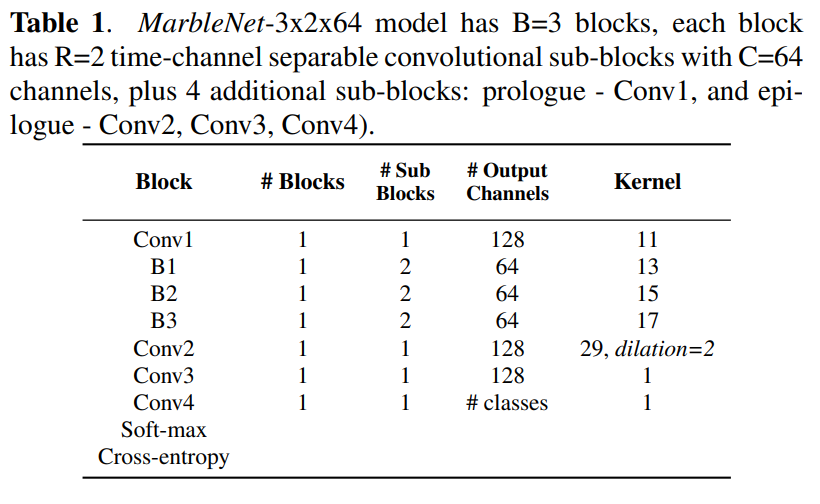 [ 표 1 ]은 MarbleNet 3\times 2 \times 64의 전체 구조를 나타냅니다.