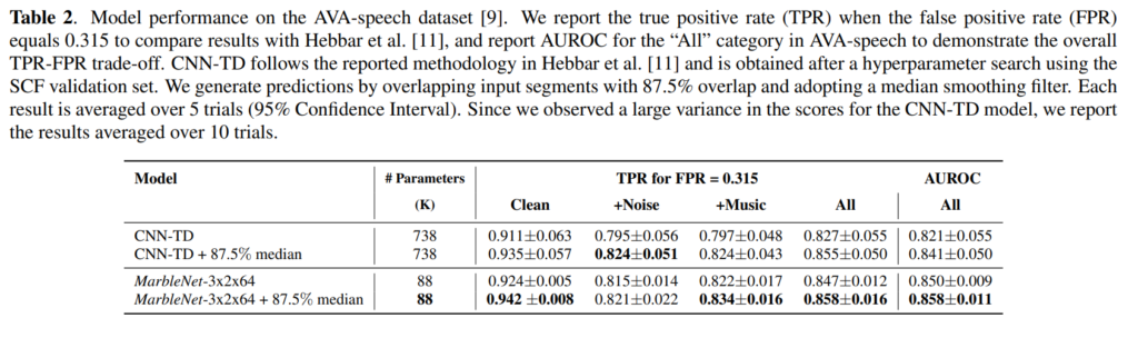 [ 표 2 ]는 AVA 음성 데이터셋에 대한 평가 결과입니다. MarbleNet은 5회, CNN-TD는 10회 반복한 결과값을 나타낸 것입니다. MarbleNet은 CNN-TD보다 더 작은 신뢰 구간을 보여줌으로써 안정적인 성능을 보이고 있습니다.