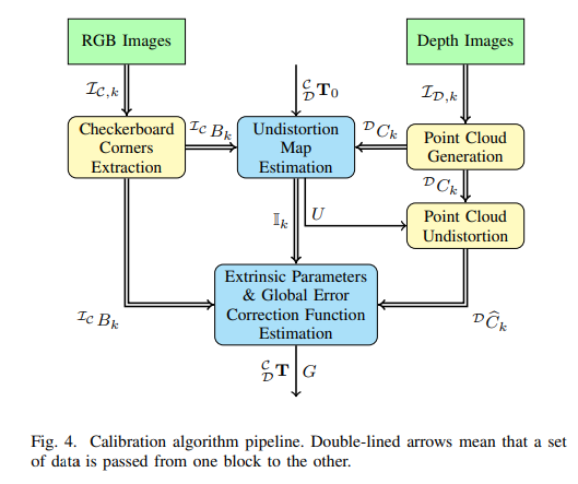 저자가 제안한 보정 알고리즘의 파이프라인은 fig 4와 같습니다. 가장 먼저 체크 보드가 촬영된 RGB 영상 \mathcal{I_{C,k}} 으로부터 체크보드의 코너 B_k 를 추출합니다. 그 다음 깊이 영상 \mathcal{I_{D, k}을 3d 포인트 클라우드화 C_k 시킵니다. 코너 값과 포인트 클라우드 뭉치들은 Undistortion Map Estimation을 통해 초기 Transformation T_0 를 기반으로 undistortion map U를 예측합니다. 이를 기반으로 undistorted point clouds \hat{C_k} 추정하여 global correction map G와 최종 카메라-깊이 transformation T 를 추정합니다.