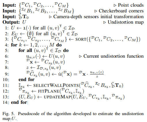 그 다음 line 9, ESTIMATETRANSFORM을 통해 체크보드 평면과 포인트 클라우드의 평면 간의 보정을 통해 카메라와 깊이 센서 간의 tranformation을 예측합니다. 해당 값은 line 11과 같이 체크보드 코너를 깊이 센서의 평면 좌표로 이동 시켜 GT로 활용합니다.