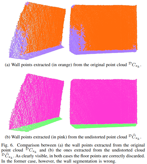 해당 보정 기법에서는 local error를 잡기 위한 보정 장치로 평평한 평면을 사용합니다. 보정 정확도를 높이기 위해서는 타겟인 벽면이 어느 위치에 있는지를 명확하게 알아야합니다. 저자는 평면을 인지하기 위해 체크보드 코너를 중심으로 포인트 클라우드에 대한 RANSAC을 수행하여 자동적으로 평면을 인지하는 방법을 사용합니다. 추가적으로 자동화된 평면 인지의 성능 향상을 위해 Fig 6과 같은 트릭을 사용합니다. Fig 6은 포인트 클라우드의 undistortion 을 수행한 결과와 수행하지 않은 결과에 대한 정성적 결과로 저자는 line 5-9에서 이전 U를 기반으로 undistortion 수행한 포인트 클라우드를 사용하여 wall point-coordinates \mathbb{I}_{s_k} 를 추출합니다.
