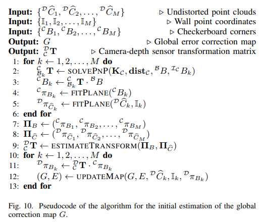 global error를 해결하기 위한 모듈은 fig 10과 같은 알고리즘을 가지고 있으며, RGB 카메라와 뎁스 센서 간의 정렬 수행을 목적으로 진행되어집니다. 입력 데이터는 이전 모듈에서 추정된 undistorted point cloud와 평면 포인트 좌표계와 체크보드 코너를 이용합니다.