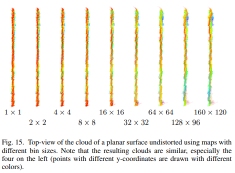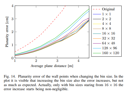 Fig 14에서는 local error에서 사용된 트릭인 bin size에 따른 정량적 실험 결과에 해당합니다. 모든 bin은 원본보다 좋은 결과를 보여주고 있습니다. bin size가 커질수록, 거리가 멀어질수록 노이즈가 누적되어 오차가 커지는 결과를 보여줍니다.