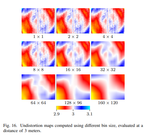 Fig 16는 bin size에 따른 undistoration map을 시각화한 결과에 해당합니다. bin size에 따라 smooth한 결과를 보여줍니다. (smooth 수록 보정시에 부드러운 결과를 보입니다.)
