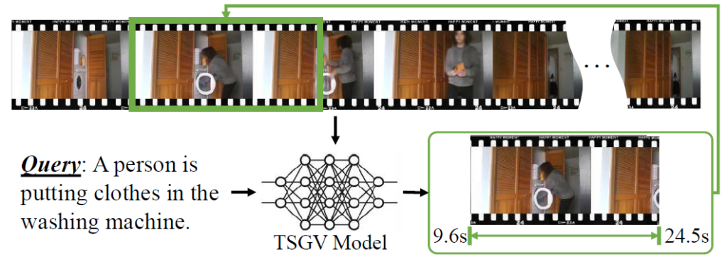 TSGV task는 그림만 보셔도 쉽게 이해하실 수 있습니다. 위 그림과 같이 text query와 video를 함께 입력으로 받습니다. 이후 잘 설계된 TSGV 모델을 거쳐 결국 비디오에서 text query의 의미론적 행동이 실제로 발생하는 구간을 찾아내는 것입니다.