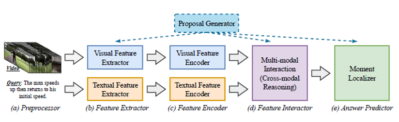 위 그림은 TSGV task 방법론들의 기본적인 파이프라인입니다. 이후 1.2절에서는 TSGV를 해결하기 위한 여러 접근법(methods)들을 소개해드릴건데, 대부분 공통적으로 위 component들은 포함하고 있다고 생각하시면 됩니다.